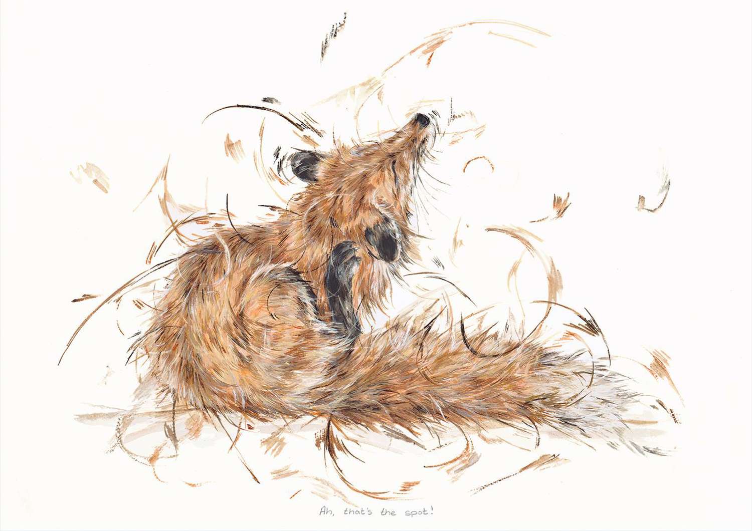 Limited edition print available mounted or framed. Painting of a red fox scratching behind the ears.
