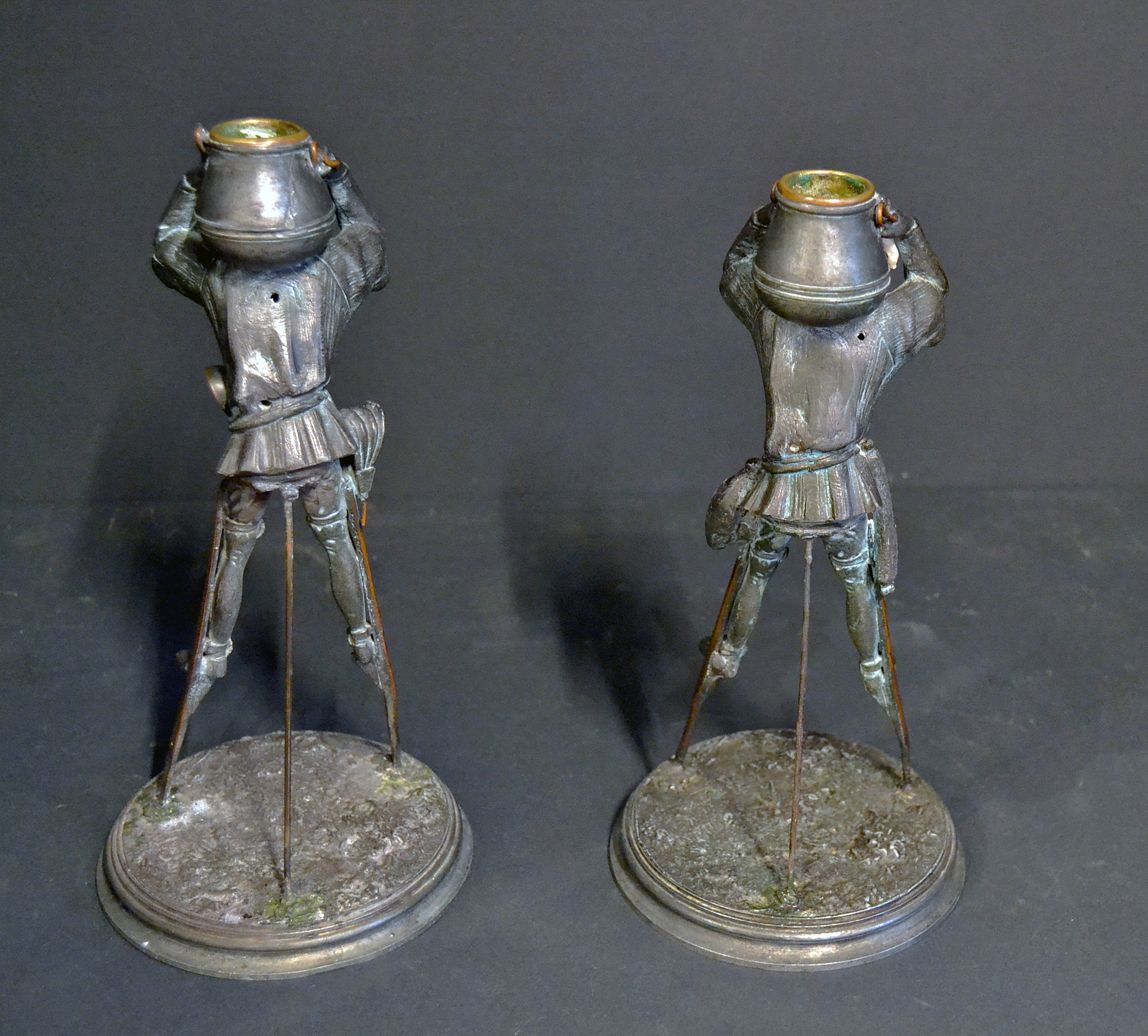 A fabulous pair of bronze patinated spelter candlesticks in the form of Medievil characters on stilts each with long pointed hats similar to those worn by jesters. Both with cooking pots on their back, the cooking pots bronze lined. One character is carrying a set of bellows and a drinking vessel or bowl, the other character is carrying a Salami and a leg of ham or lamb. Height 9 and a half inches on a circular base just over 4 and a half inches in diameter. Probably late 19th century.