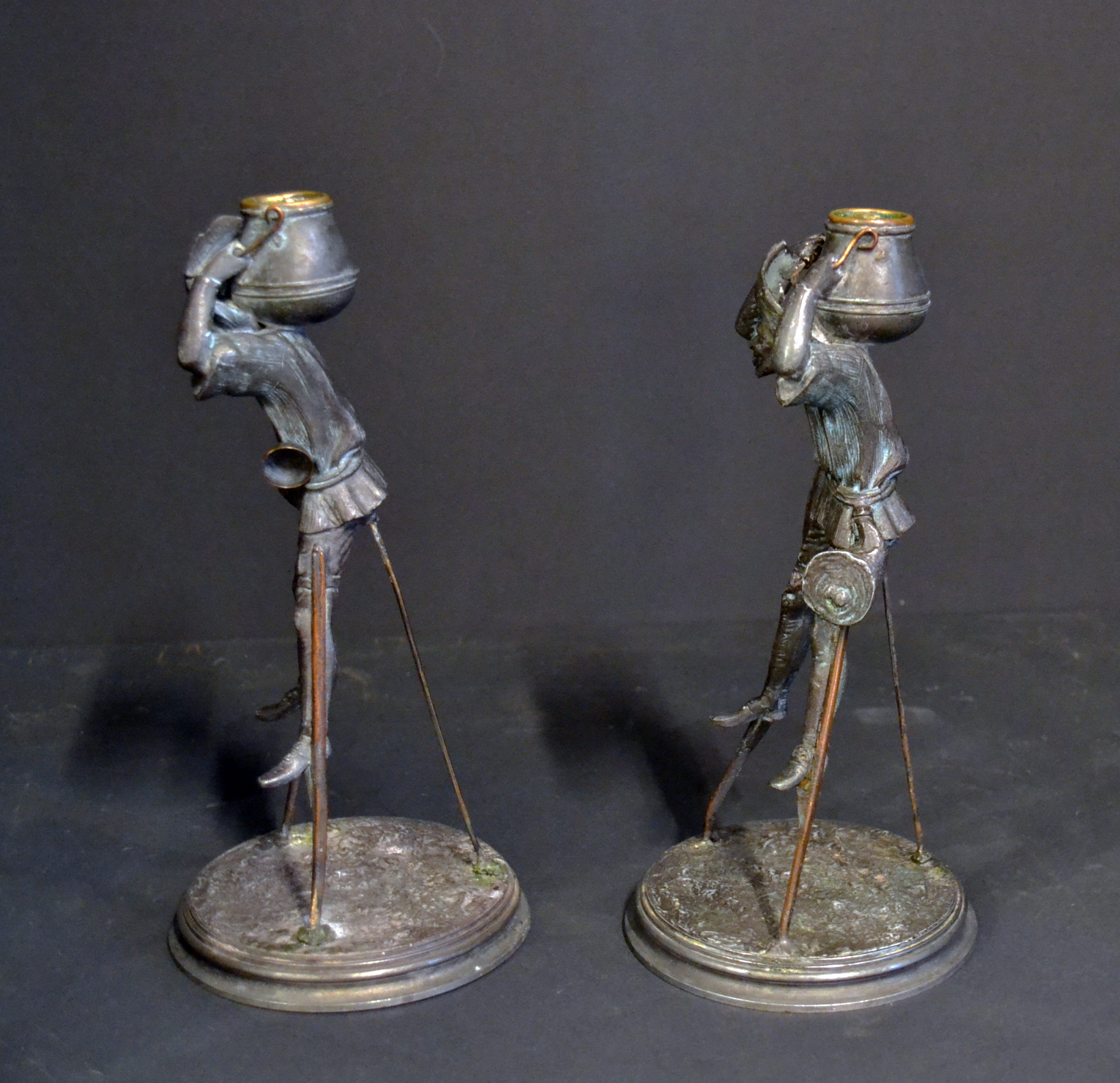 A fabulous pair of bronze patinated spelter candlesticks in the form of Medievil characters on stilts each with long pointed hats similar to those worn by jesters. Both with cooking pots on their back, the cooking pots bronze lined. One character is carrying a set of bellows and a drinking vessel or bowl, the other character is carrying a Salami and a leg of ham or lamb.