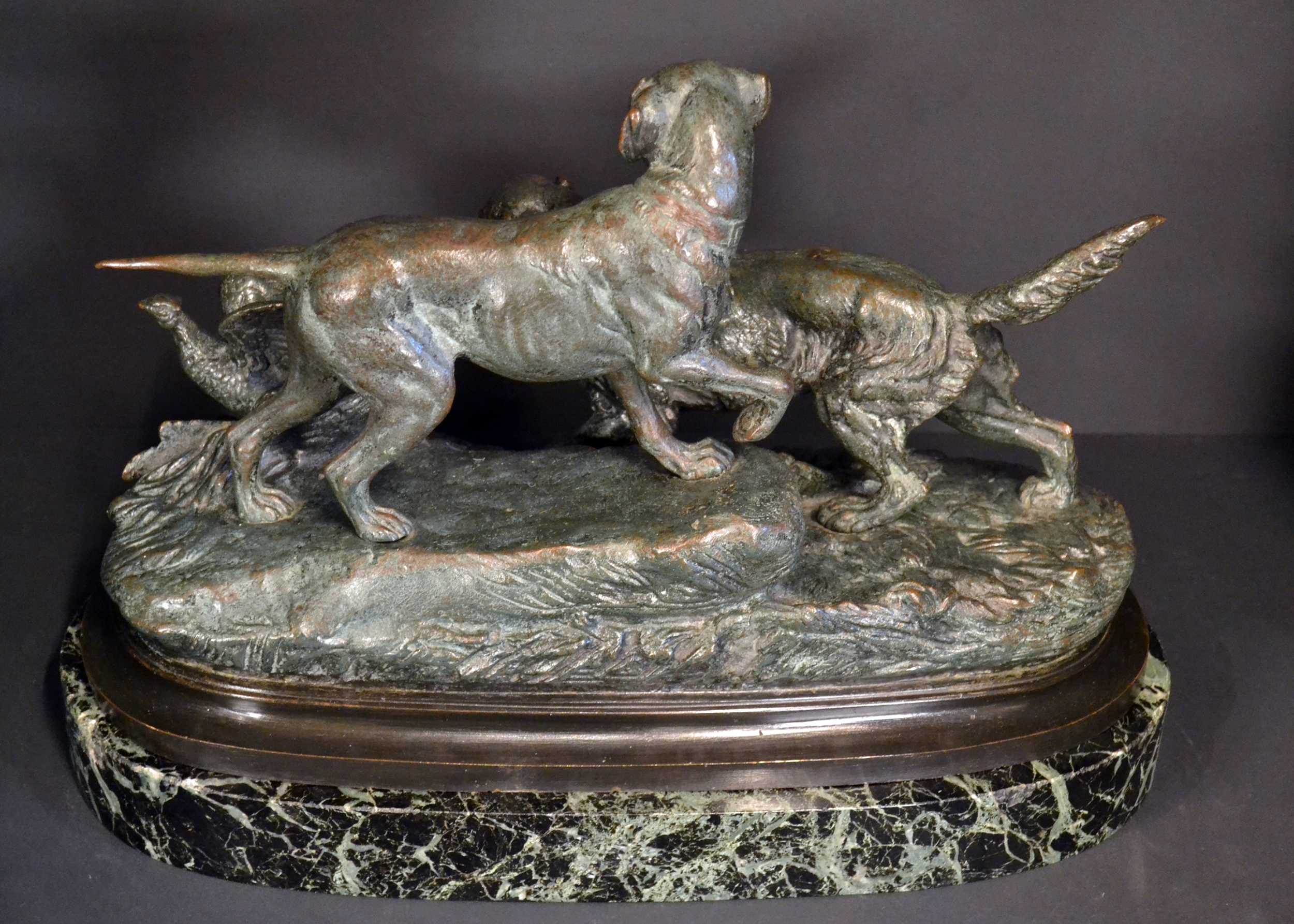A good and impressive late 19th century bronze of a setter and a smooth haired pointer putting up a pheasant in a naturalistic landscape. Original verdigris and brown patination and Title plaque. Exhibited on the original green marble base. The bronze in excellent original condition, a few minor chips to the marble base to edges.